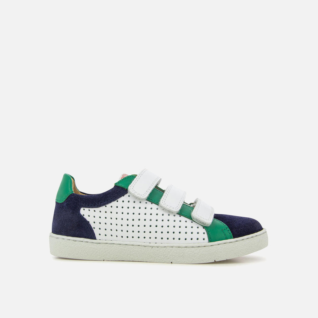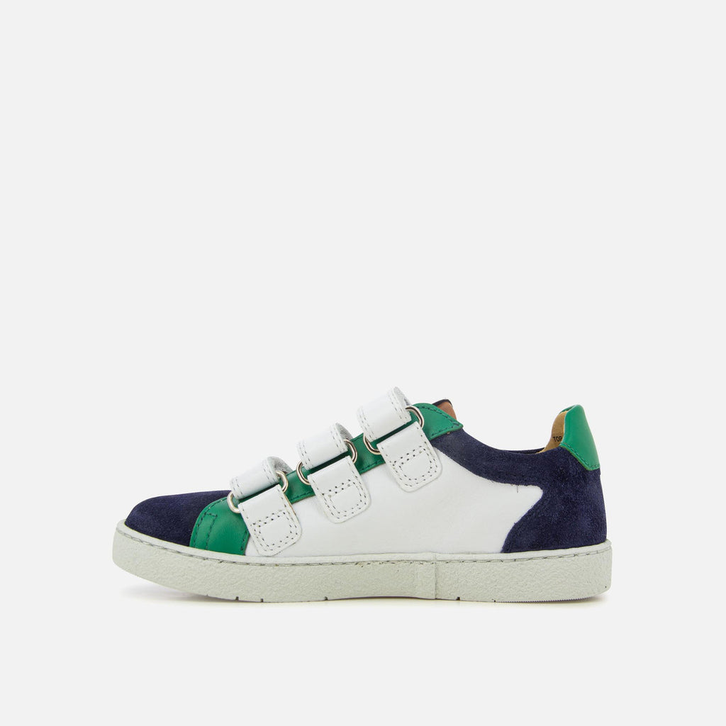 Top Lo Easy Clay is a low-top children's sneaker from our Athlet's collection, presented here in a white and multicolored smooth leather version. Lightweight and with a real rubber sole, its lining and removable insole are made of hypoallergenic microfiber, made from corn. It adjusts to the ankle and instep thanks to its three self-gripping bands.