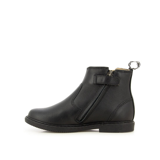 City Jodzip is a child's ankle boot presented here in a smooth black leather version with silver elastic. Lightweight and fitted with a real rubber sole, it is easy to put on thanks to its inside zip and adjusts to the ankle and instep thanks to the elastic.