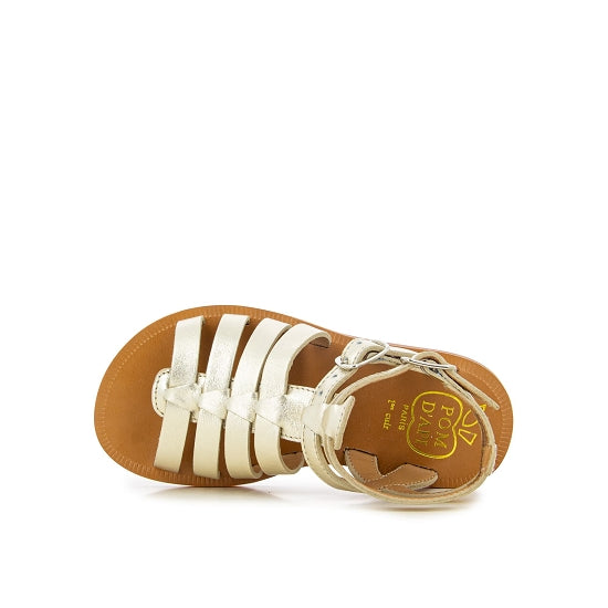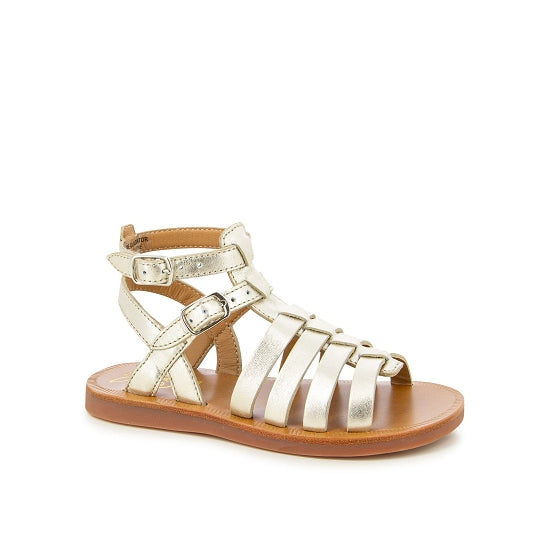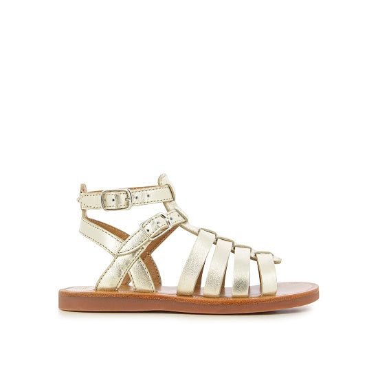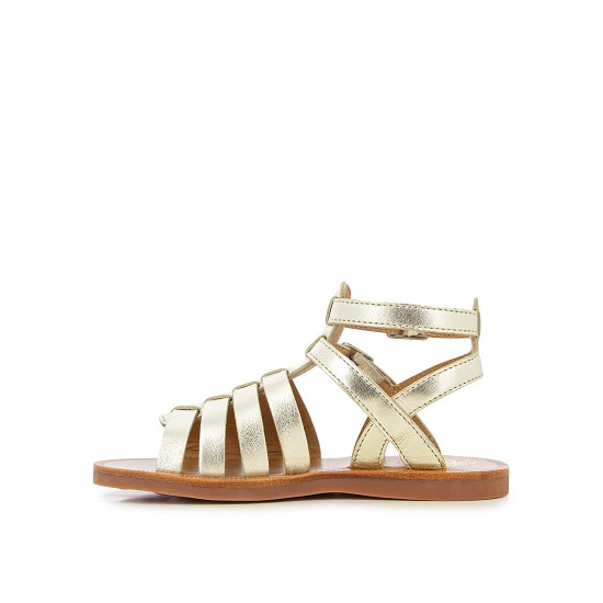 Plagette gladiator is a strappy sandal for children presented here in smooth platine leather. Lightweight and equipped with a flexible genuine rubber sole for the smooth rolling of the foot, it has a high upper for good ankle support. Easily adjustable thanks to its buckles, it will fit both slender and stronger ankles.