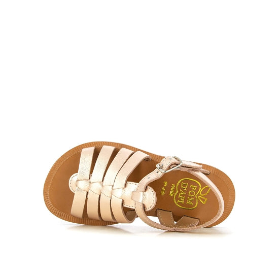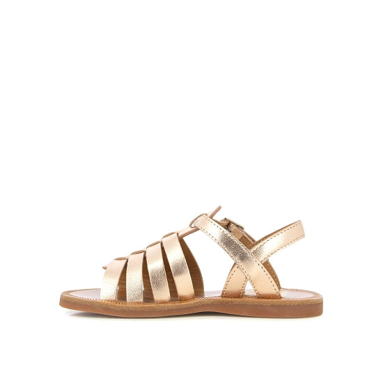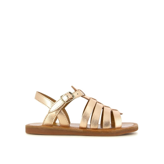 Plagette strap is a strappy children's sandal presented here in copper leather. Lightweight, it has a flexible genuine rubber sole for the smooth rolling of the foot. Easily adjustable thanks to its buckle, it will fit both slender and stronger ankles.