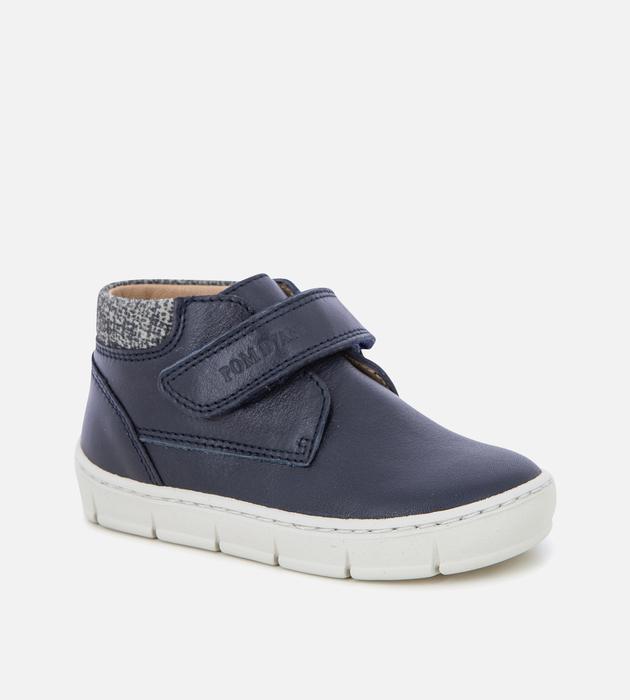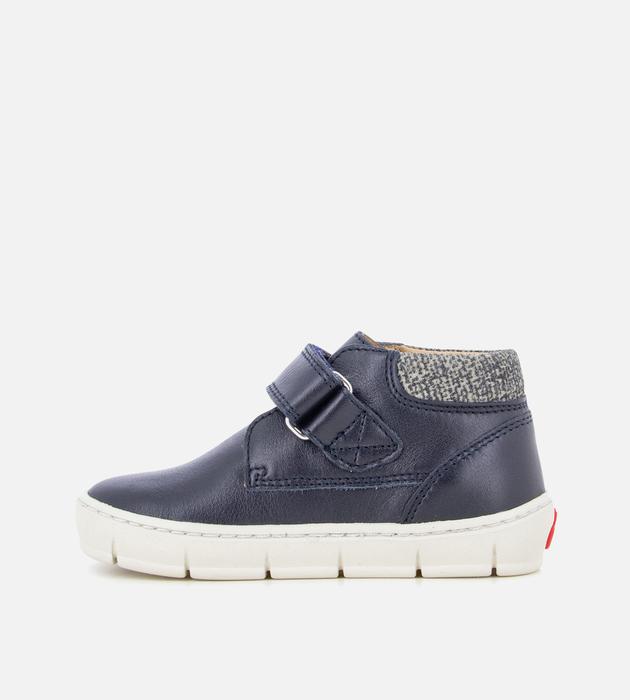Start is a children's shoe presented here in a version in smooth navy leather, with a gray printed suede insert at the ankle. Lightweight and with a real rubber sole, it has a high upper with a hook-and-loop strap, for optimal adaptation to the ankle and instep shape.